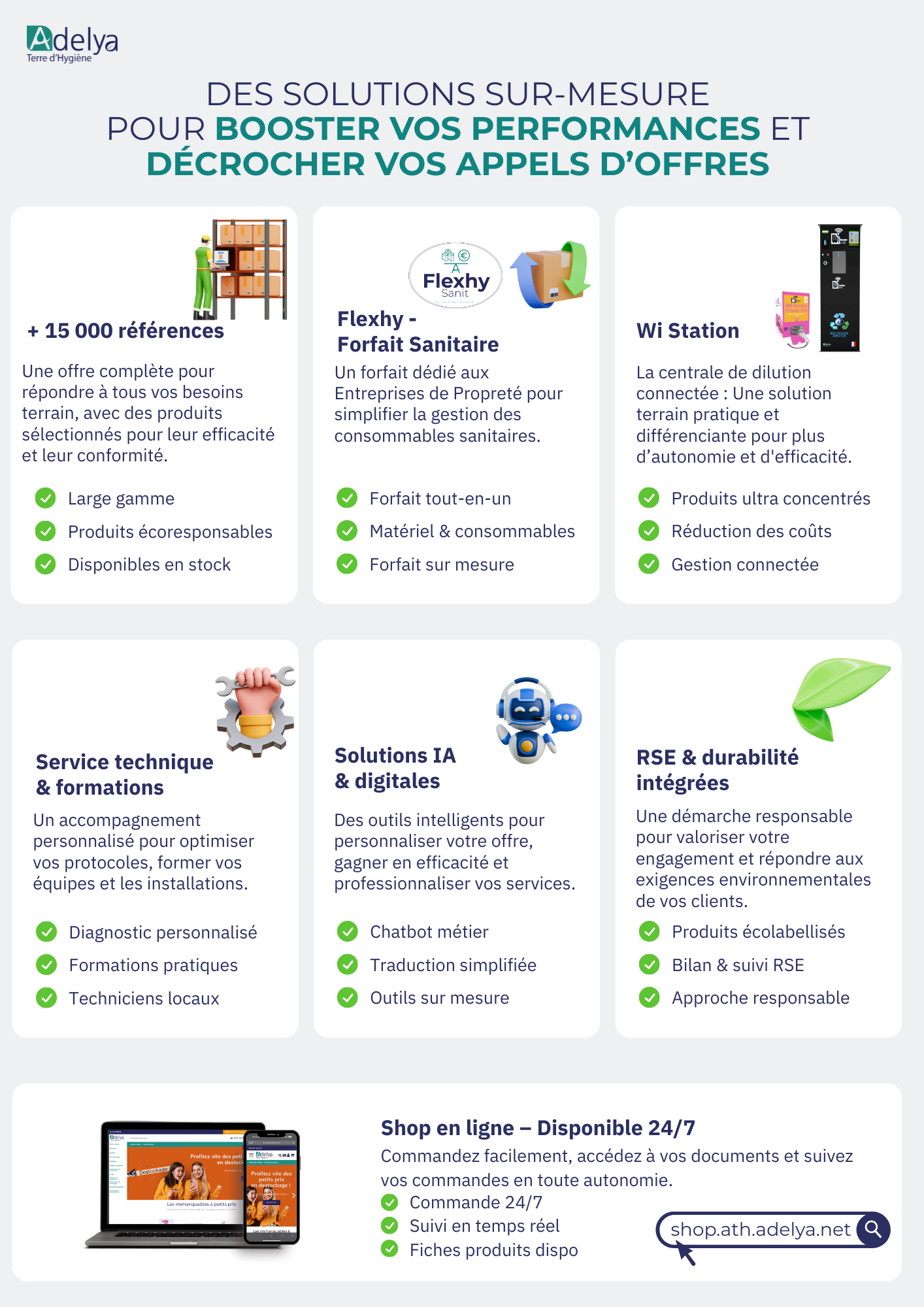 Depuis plus de 35 ans, Adelya Terre d’Hygiène accompagne les Entreprises de Propreté dans leurs enjeux quotidiens : hygiène, efficacité, sécurité, rentabilité. Ils interviennent aussi auprès des collectivités, établissements de santé, industries et entreprises privées, toujours avec une même exigence : proposer des solutions professionnelles, innovantes et responsables.